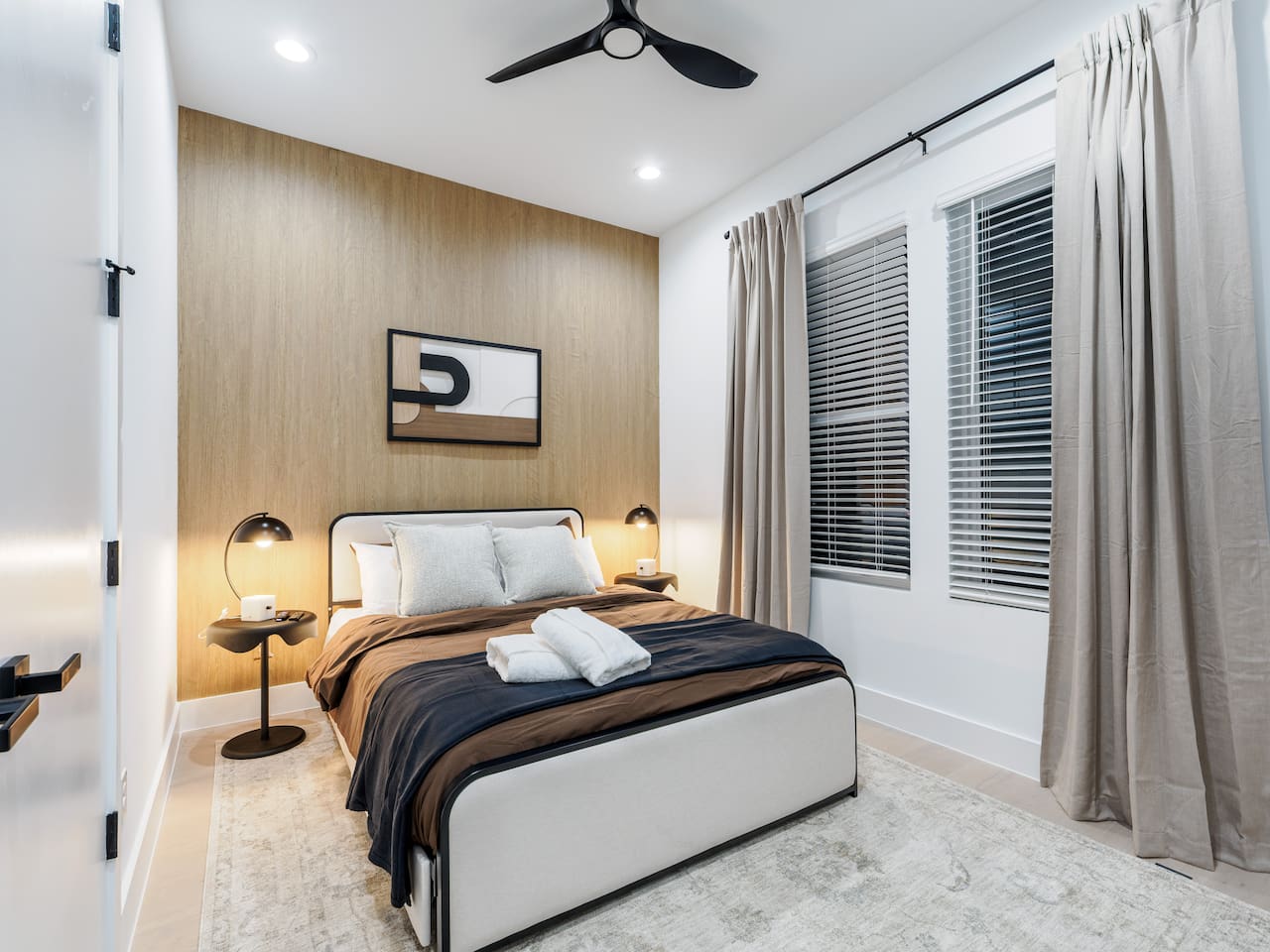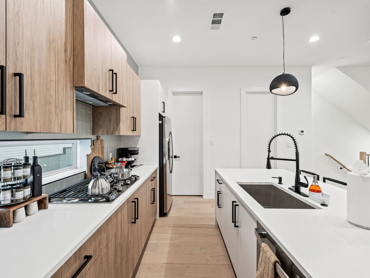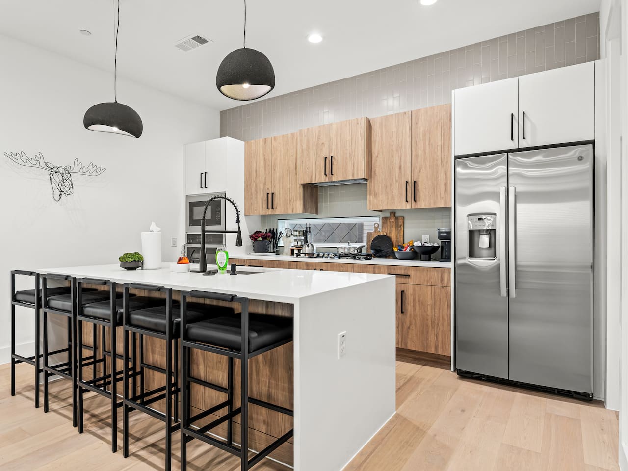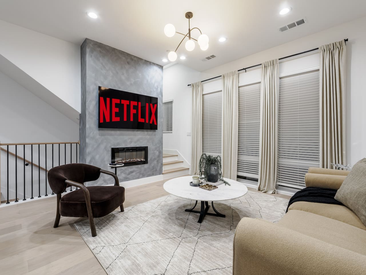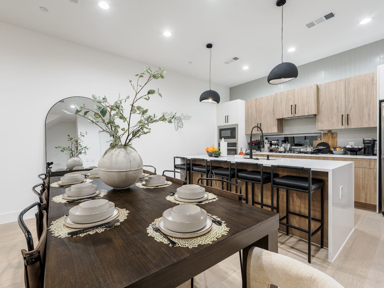 KEY AMENITIES / DETAILS: ✓ 3 bedroom townhouse ✓ 3.5 bath ✓ Sleeps 12 in 1 King Bed, 1 Queen Sleeper sofa, 2 Queen stand-alone beds, 2 Queen Beds (bunkbed) ✓ Check-in process: Keyless entry with your private access code ✓ Ultra high-speed Fiber Wi-Fi ✓ Parking: Free 2 car garage parking available and free street parking ✓ Kitchen: Fully stocked kitchen ✓ Work from home: 1 desk + office chair + monitor + mouse provided ✓ Coffee Maker and coffee provided ✓ Tech: (4) 4K smart TV’s ✓ HVAC: Central Air Conditioning & Heating ✓ Indoor electric fireplace ✓Private rooftop terrace- Firepit with 2 chairs, dining table that sits 6, and (1) 4K smart TV ✓Washer & Dryer ABOUT THE COMPANY: As Professional hosts we are obsessed with quality service & amenities. We don't have crazy check out procedures, we only use professional cleaners, and we're available 24 / 7 / 365 (often within seconds) We provide our valued guests with seamless lodging experiences & top-notch amenities - ultra high speed internet, coffee, quality linens, clean spaces, remote work space, and more! CLEANING PROCEDURES: Our in-house cleaners are professionally trained with a passion for what they do! Our team follows an industry-leading cleaning checklist, and our operations team executes randomized inspections to ensure our standards are met. DETAILED FEATURES: ➤ 1946 sq ft, 3 bedrooms / 3.5-bathroom townhome ➤ Check-in: Fully keyless entry with codes provided prior to check-in ➤ Sleeps:12 comfortably - 1 King Bed, 1 Queen Sleeper sofa, 2 Queen stand alone beds, 2 Queen Beds (bunkbed) ➤ Parking: Free garage parking for 2 cars and free street parking available (please do not park in the driveway blocking other vehicles) ➤ Wi-Fi: High-speed fiber internet with strong coverage everywhere in the unit ➤ Workspace: A dedicated desk, mouse, and monitor ➤ Kitchen: Fridge, fully stocked with pots & pans, knife block, blender, toaster, air fryer, microwave, range, utensils, service for 12, spices, and more! ➤ Outdoor Space: Private rooftop access with breathtaking skyline view, large HDTV with all major streaming platforms, dining table seating 6, and firepit with 2 chairs. ➤ Technology + Security: External cameras ➤ TVs: 4 Smart TVs ➣ Streaming TV including Netflix is included. ➤ Dining: Seating for 12 with dining table and dining counter, great for entertaining ➤ Central air conditioning & heating ➤ Location: Dallas Bishop Arts area